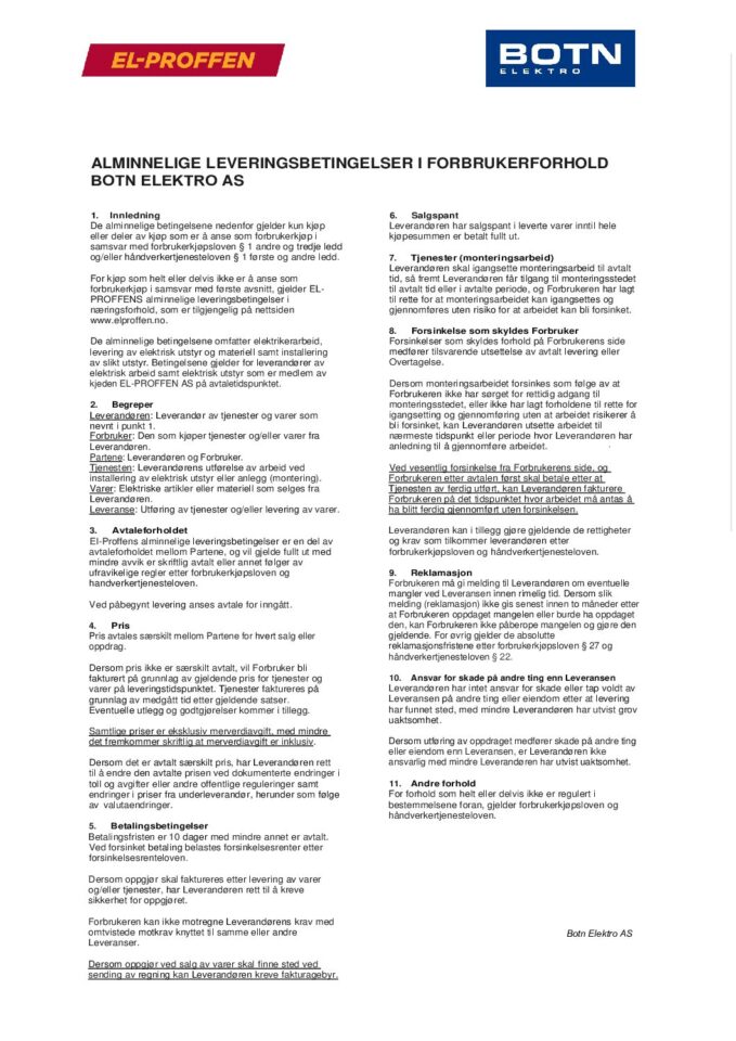 Botn Elektro Leveringsbetingelser Privat Næring